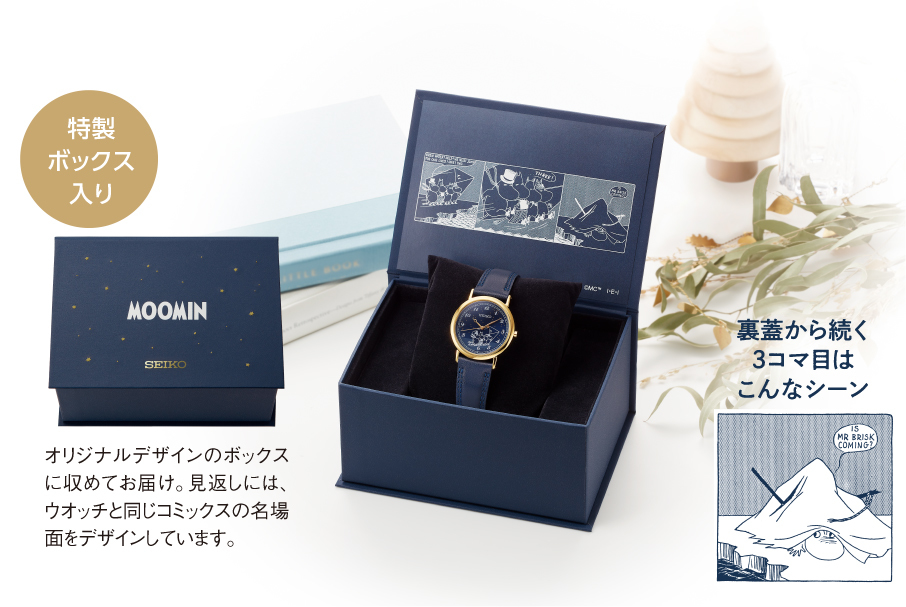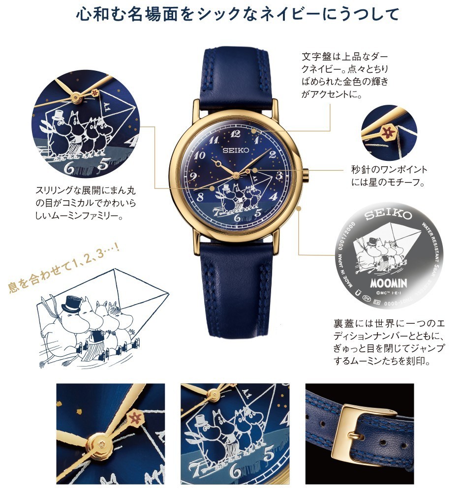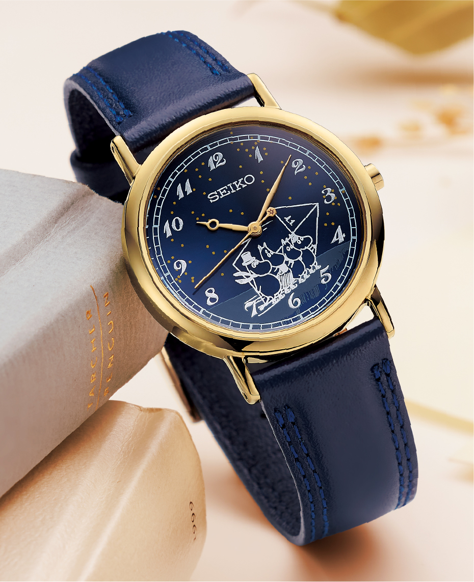 金色の輝きが浮かぶ、洗練されたダークネイビーの文字盤。艶めく氷の上にはムーミンパパ、ムーミンママ、ムーミントロールに、スノークのおじょうさんがデザインされ、金色の秒針には星のモチーフがワンポイントにあしらわれています。