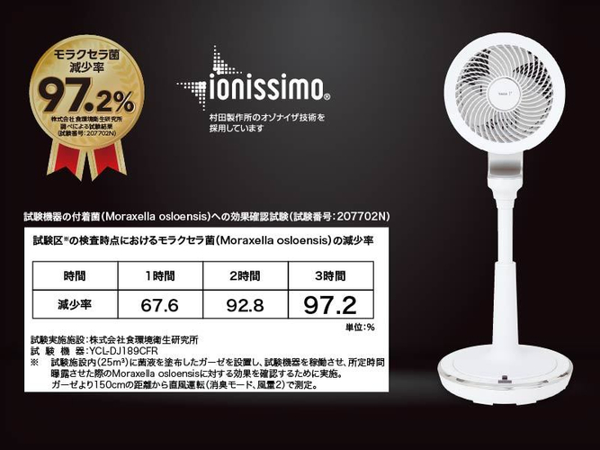 株式会社食環境衛生研究所にて試験施設内(25m3)に菌液を塗布したガーゼを設置し、試験機器(スタンド消臭DCサーキュレーター YCL-DJ189CFR)を稼働させ、所定時間曝露させた際のモラクセラ菌に対する効果を確認するために実施しました。(試験番号:207702N)