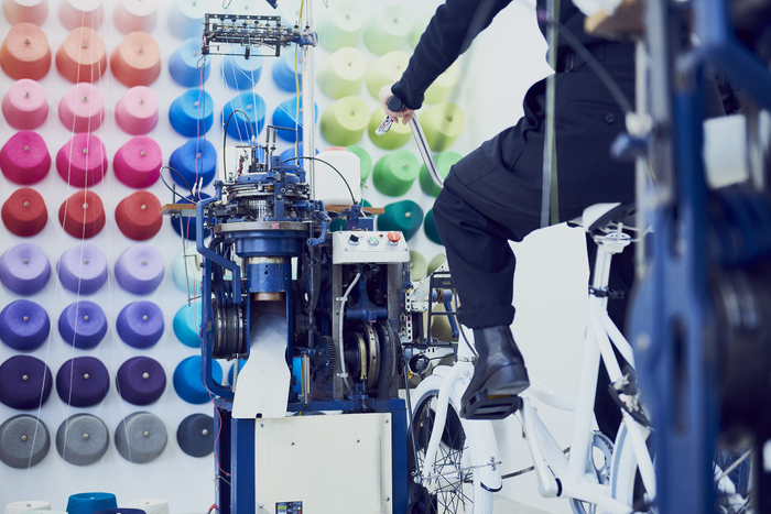 「チャリックス」は靴下工場である株式会社 創喜によって開発された、自転車を漕ぐ力を使って靴下を編むことができるオリジナルマシーンです。12〜36色の糸から3色を選び、好みのサイズと丈を選択したのち、10分ほど分自転車を漕ぐと靴下が編みあがります。編みあがった靴下はスタッフがその場でつま先の縫製と温風で仕上げを施し、最後に利用者がタグに自分の名前を記入して完成。靴下の製造工程の一連を体験しながら、自分だけの靴下をつくることができます。出来上がった靴下はローゲージの大きな編み目が特徴で、肉厚でふっくらとした履き心地が楽しめます。