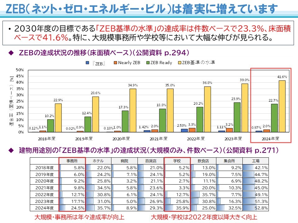 ・2024年度における「ZEB基準の水準」の達成率は件数ベースで23.3%(2023年度19.7%)、床面積ベースで41.6%(同39.0%)となりました。規模別・建物用途別に見ると、大規模事務所では17.7%から24.5%、大規模学校では25.8%から35.9%へと達成率が大きく向上しています(いずれも件数ベースの達成率)。