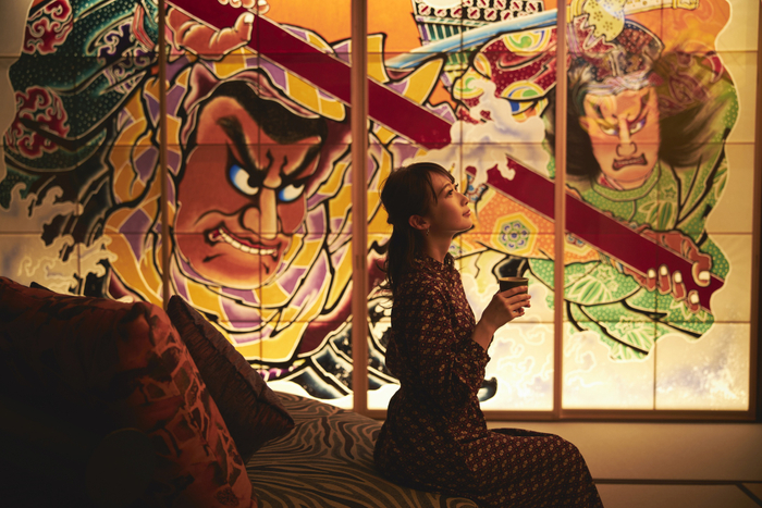 青森ねぶたの間の寝室には、仏教世界において東西南北を守る四天王である持国天(じこくてん)、広目天(こうもくてん)、増長天(ぞうちょうてん)、多聞天(たもんてん)のお面が設えられています。四天王は、仏法の敵である邪鬼(じゃき)を睨みつけていると言われます。これらのねぶた面に守られているように過ごせます。