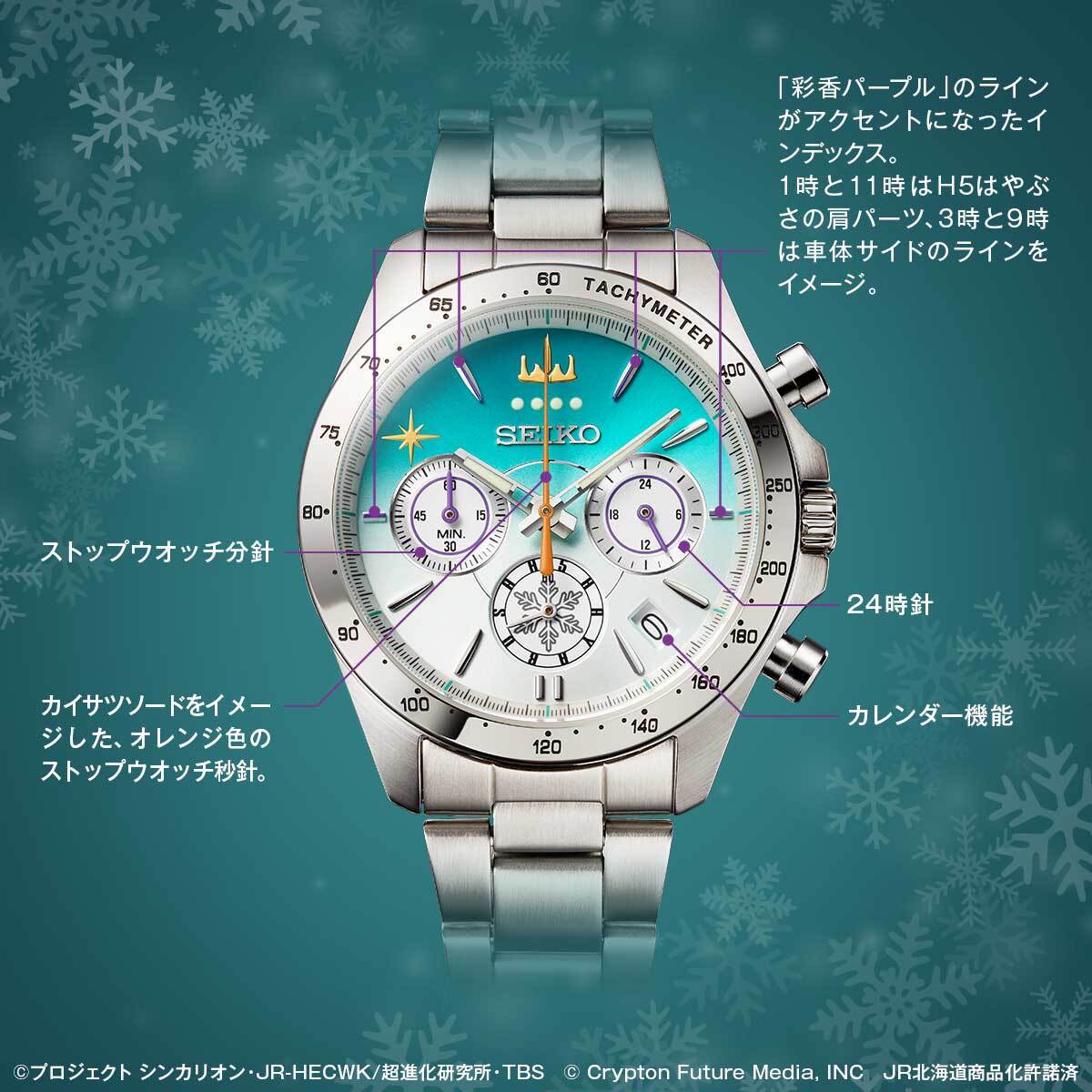 3時と9時のインダイヤルは、バーチャル・シンガー「初音ミク」とのコラボレーションから誕生したキャラクターで、「シンカリオン H5はやぶさ」の運転士である「発音ミク」の髪飾りがモチーフ。