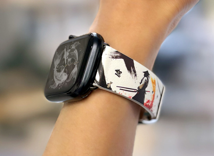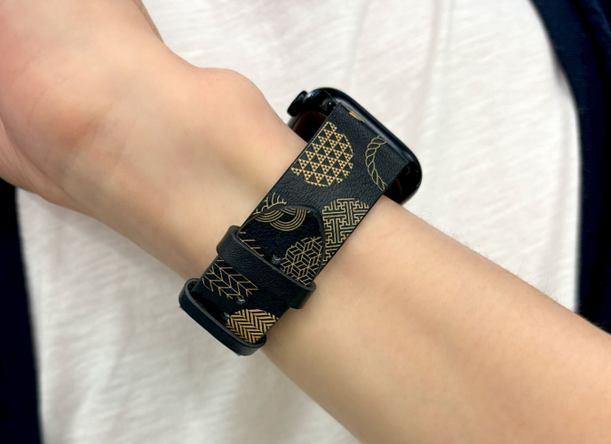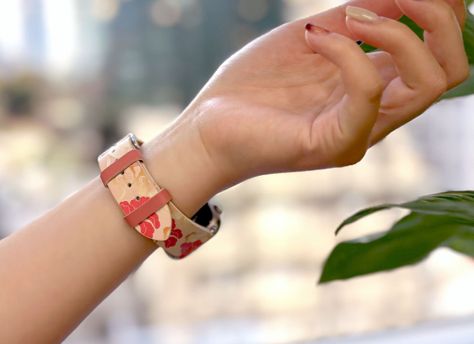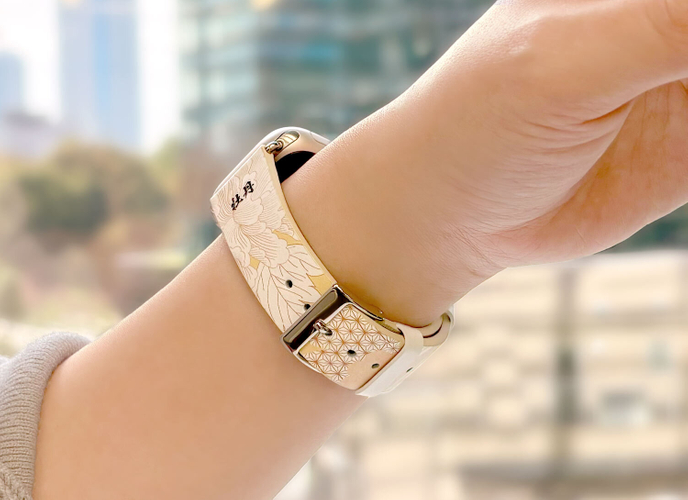 「KIMONO(キモノ)」では、肌触りの良い牛本革を採用し、裏面にもヌバック加工を施した牛本革を使用。ウレタンやラバーとは異なり、快適さと長時間の装着にも対応できる柔らかな使用感を提供します。また、UV印刷技術により図案の鮮やかな色彩と細部の精密さを再現しました。折り曲げにも強く耐久性も抜群です。