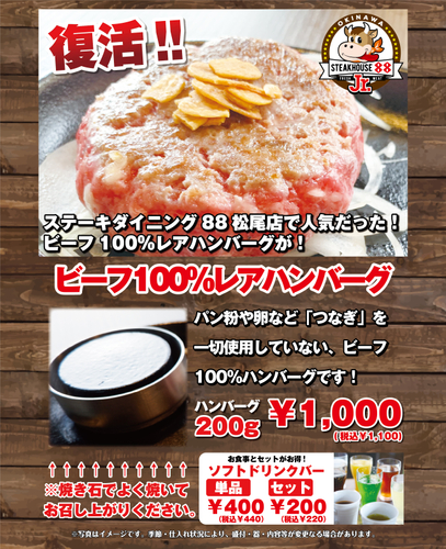 ステーキハウス88グループは、4月3日(土)ステーキハウス88Jr.真嘉比店限定で「ビーフ100%レアハンバーグ」を販売することになりました。