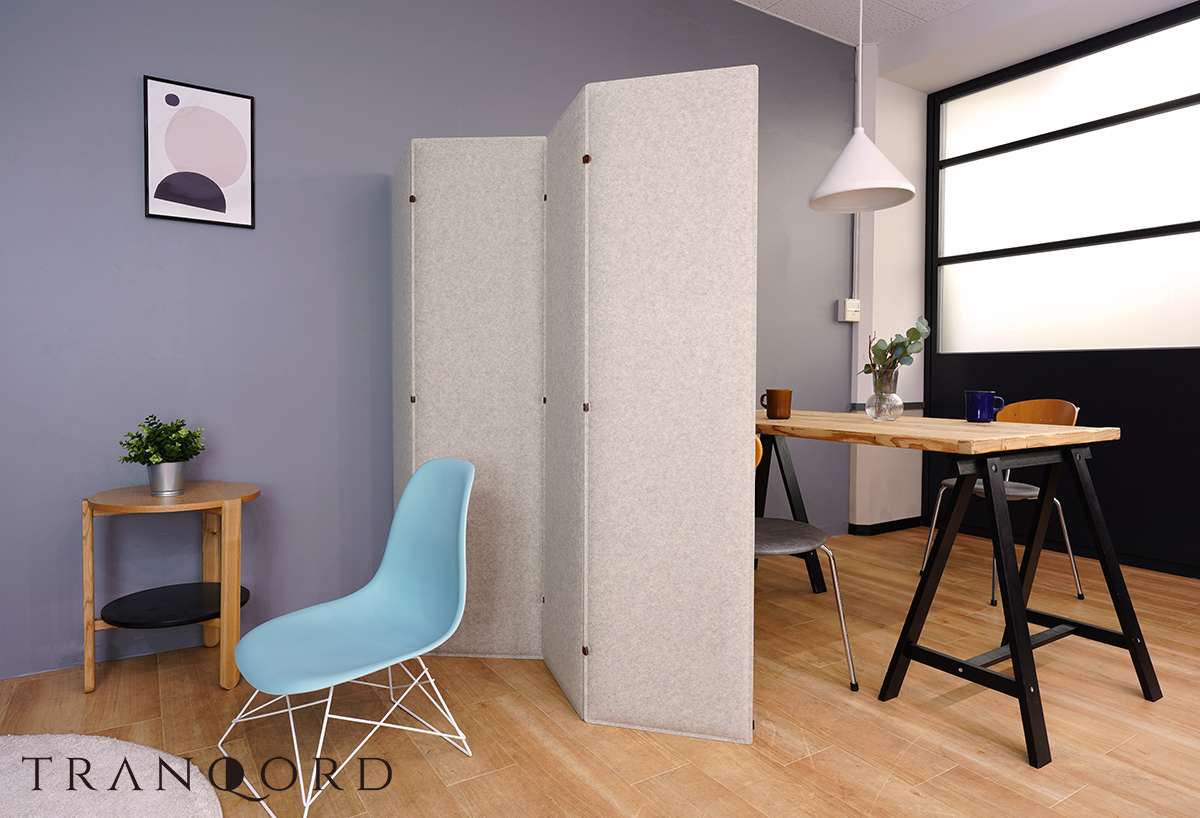 視線を遮るだけでなく、囲われた空間の内外の音をTRANQORDが吸音し和らげることで、自宅内でオンとオフが混在することによる気疲れを解消し、完全な分離とは違った家族との心地良い距離感を作り出します。