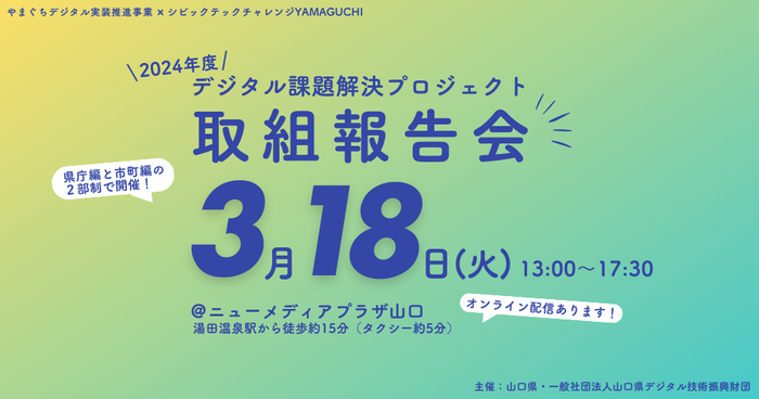 株式会社リアルグローブ(本社:東京都千代田区、代表取締役社長:大畑 貴弘 以下、リアルグローブ)は、2025年3月18日(火)に山口県・ニューメディアプラザ山口で開催される「やまぐちデジタル実装推進事業」の取組報告会において、デモ展示および成果報告を行います。