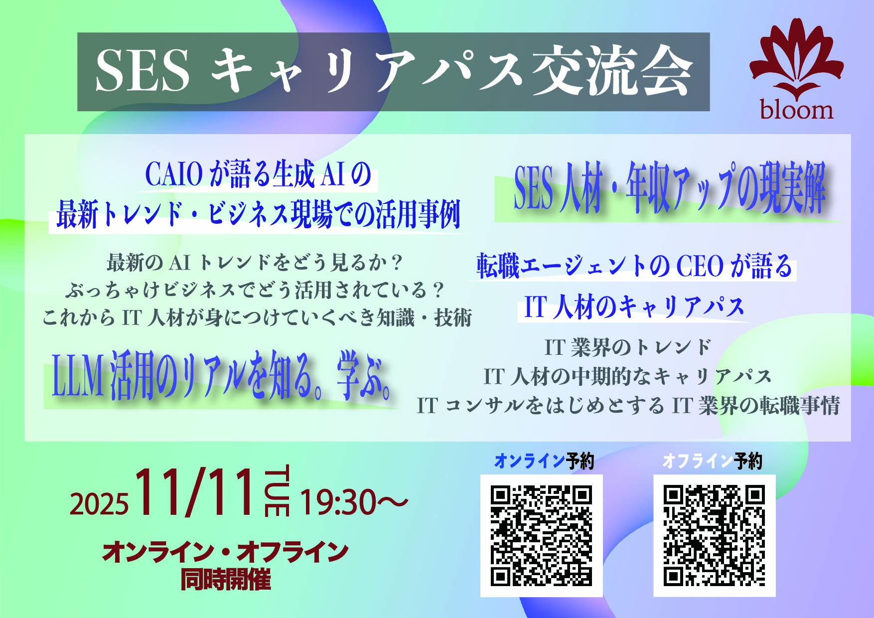 bloom株式会社は、11月11日(火)に【SESキャリアパス交流会】を九段下、神保町にあるシェアオフィスBuD squareのラウンジで開催いたします。