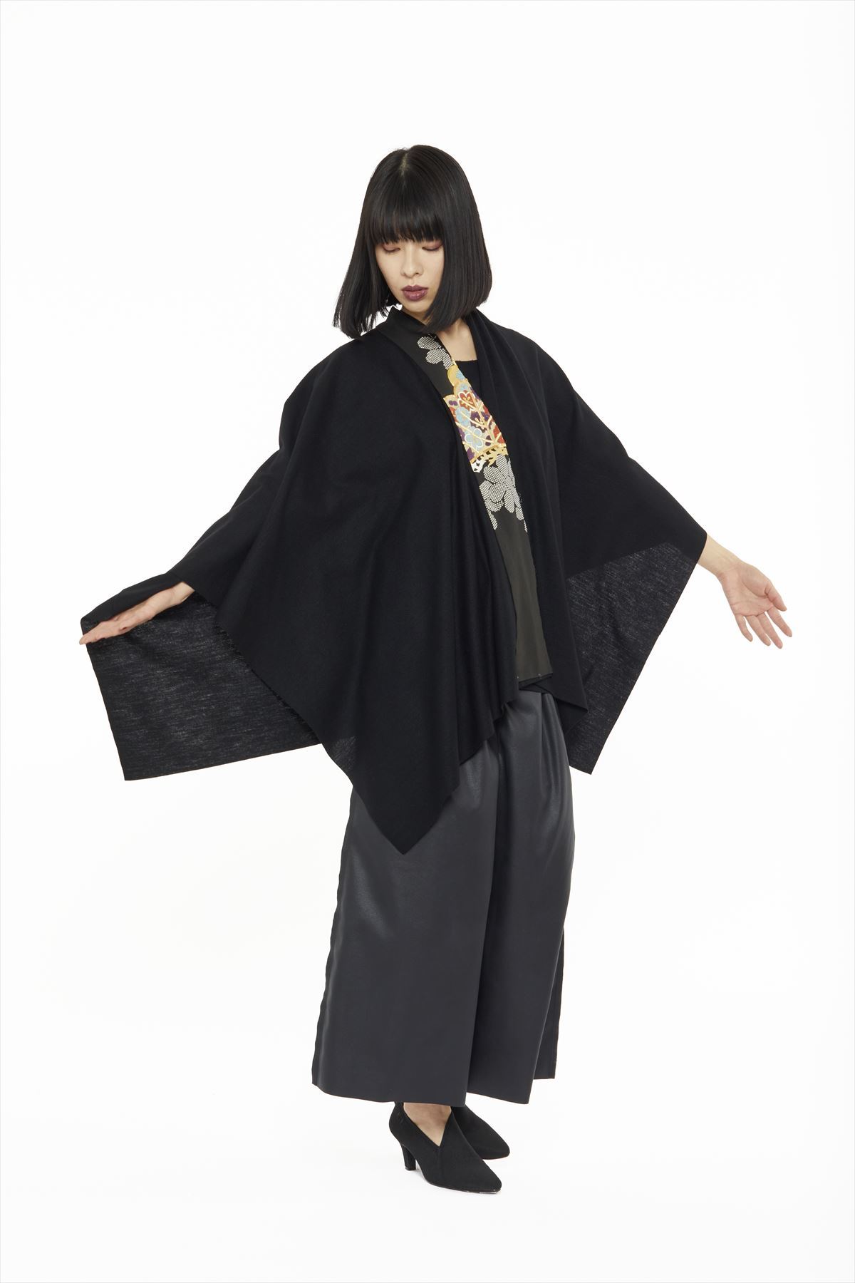 シンプルな服に1枚羽織るだけで簡単に個性的にオシャレになる。たたむと平たくコンパクトで何通りにも着ることができるのが特徴です。