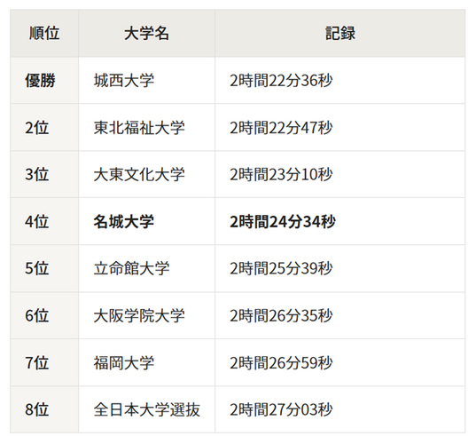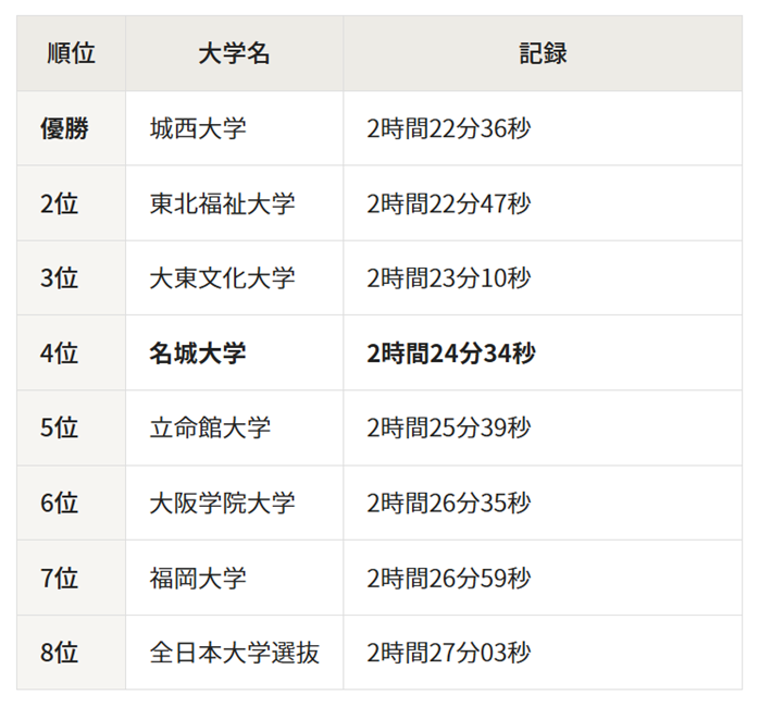 本学の総合タイムは2時間24分34秒。優勝した城西大学はそれより1分58秒先行した2時間22分36秒。2位の東北福祉大学は2時間22分47秒で続き、3位の大東文化大学は2時間23分10秒で、米田勝朗監督は「イメージしていた区間配置ができなかったのが最大の敗因」と今大会を振り返った。
