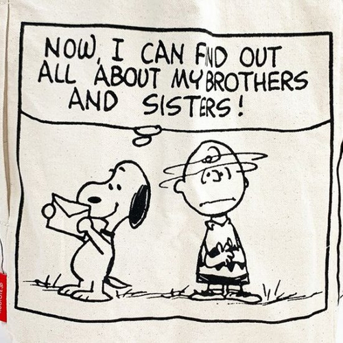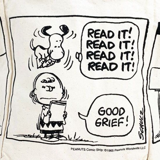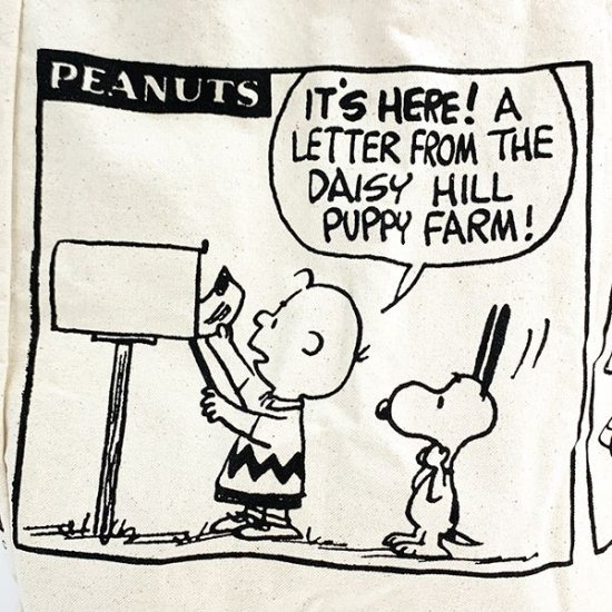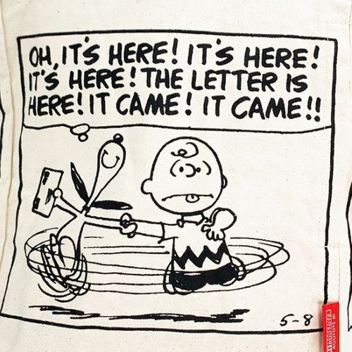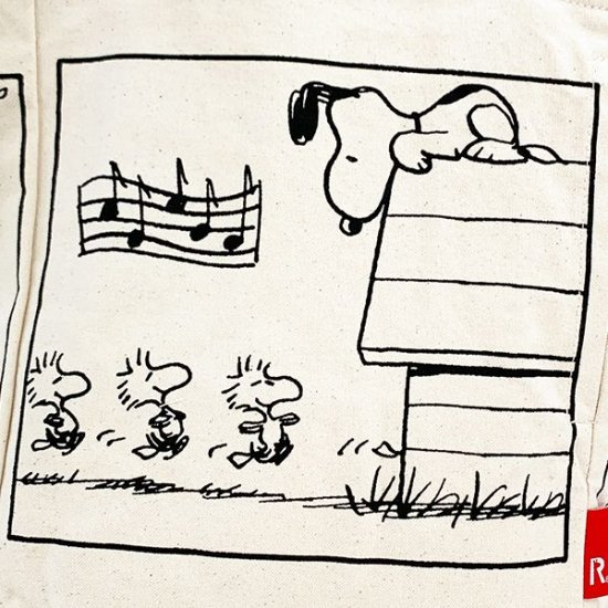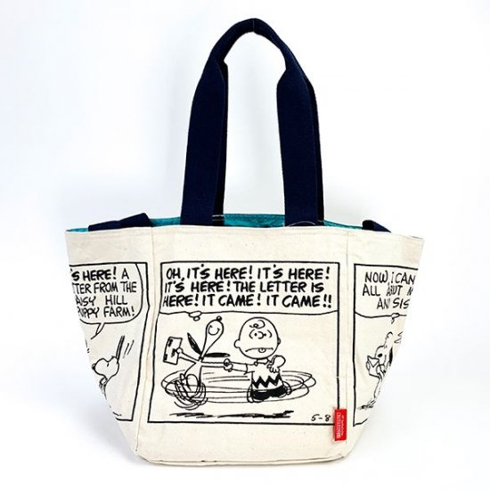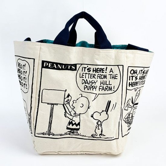 アイボリーのナチュラルな生地に、スヌーピーのコミックデザインが映えるスクエアバッグです。ネイビーの持ち手も大人っぽいアクセントに♪