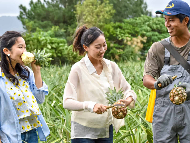 果物売り場に並んでいるパインの姿は知っていても、畑でどのように実が育ち、葉っぱの形がどうなっているのか、農家さんが分かりやすく紹介します。実際に鎌を使ってパインの収穫も行い、大人同士やご家族まで楽しめる体験です。体験した後は、収穫したパインの皮を剥いでまるまる1個かぶりつき、パインの甘い香りとともに、パインの美味しさを楽しめます。