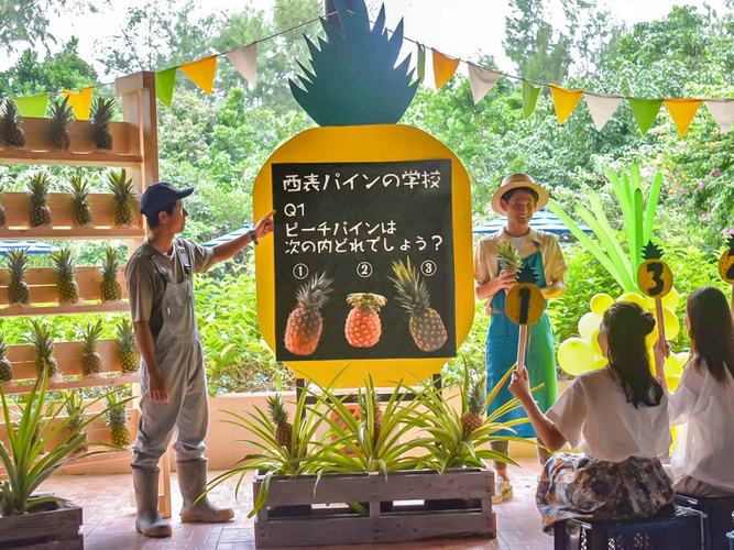 パインをより一層楽しんでいただくために、期間中、毎日「パインの学校」を開講します。西表島のパインがなぜ美味しいのか、美味しいパインの見分け方、パインと料理の組み合わせなど、実際にパイン農家に行きレクチャーを受けたスタッフが話します。週末には、パイン農家さんが来て、産地農家だからこそ知るパインの秘密を伝授します。最後には、パインの食べ比べを行い、西表島のパインの甘さを食べて知ることができます。