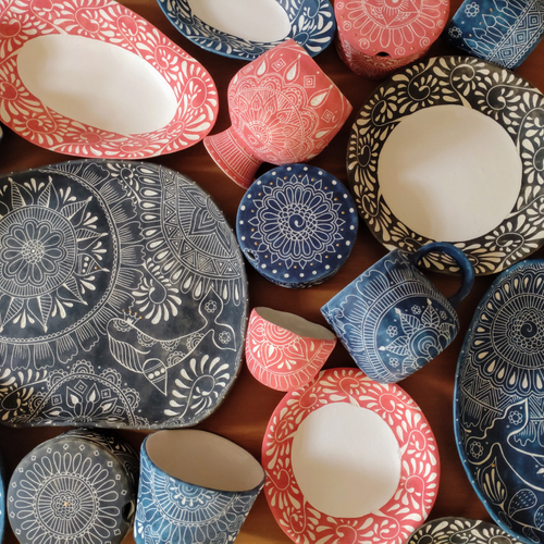 沖縄の琉球かすり・青森のこぎん刺しなどの模様をモチーフにしたうつわを制作。