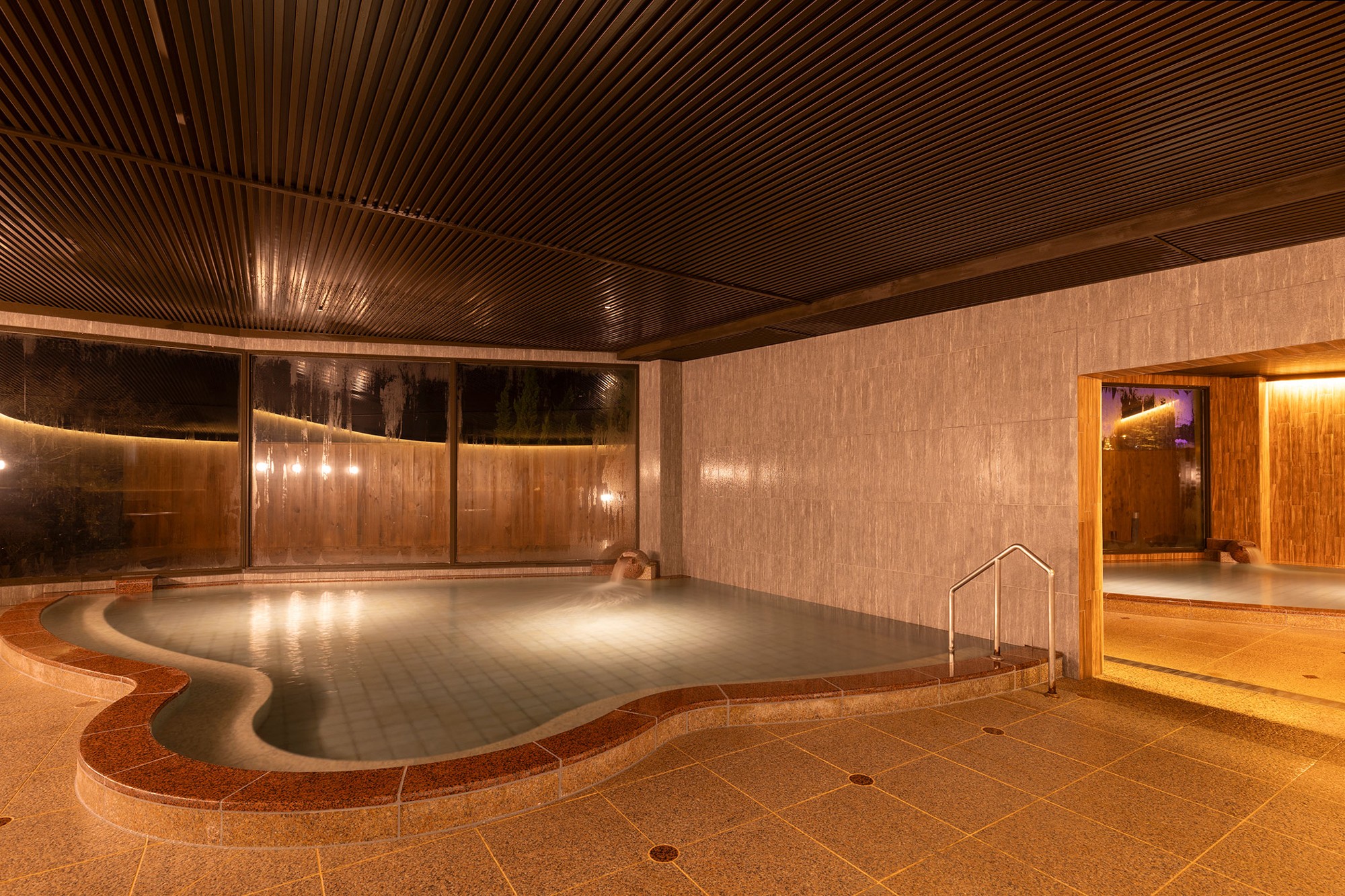 開放感にあふれた空間で温泉を楽しめる大浴場。ちょっとした贅沢感を楽しめるメニューやその土地ならではの食材を味わえるバイキング。