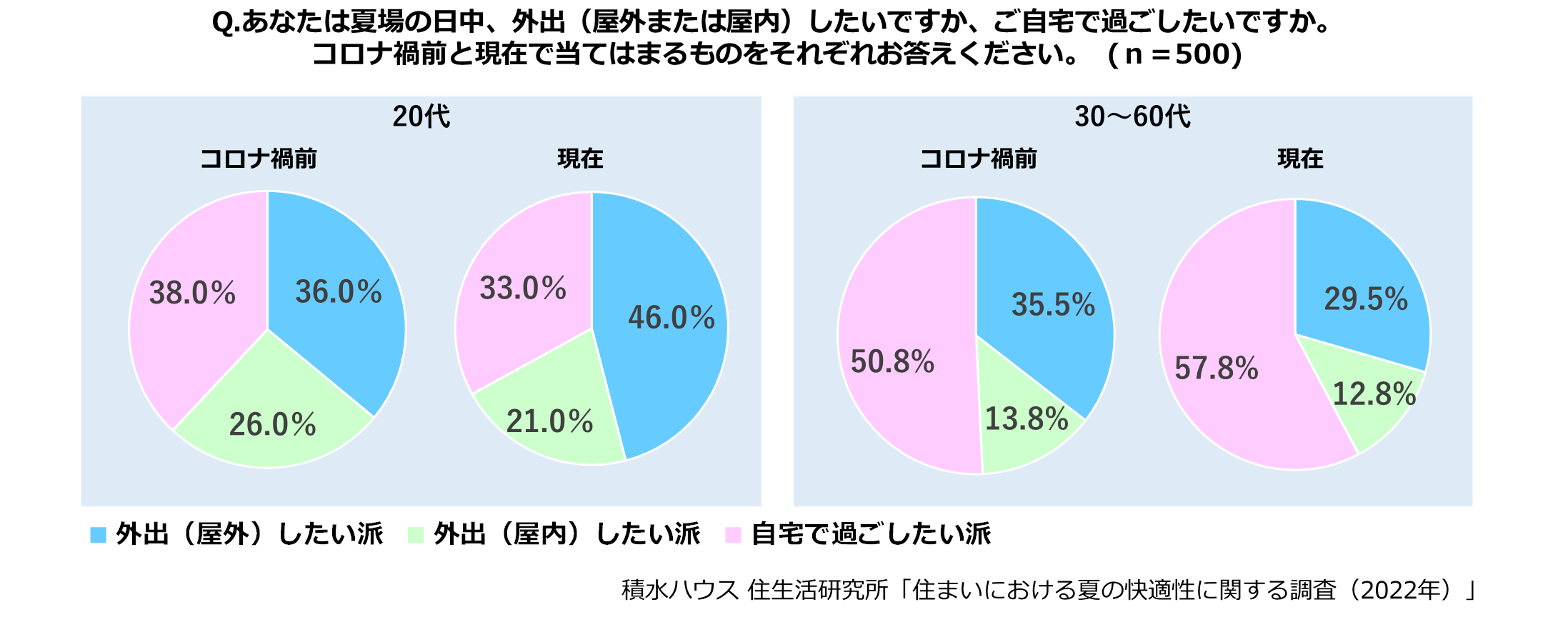 夏場の日中の外出に関する調査結果によると、コロナ禍前と比較し20代は外出(屋外)したいと回答した方が1.3倍になり(36.0%→46.0%)、約3人に2人が外出(屋外または屋内)したいと回答しました。一方、30~60代においては、実はコロナ禍前から、50.8%と半数が自宅で過ごしたいとの回答でしたが、現在は57.8%とさらに7ポイント増加しました。外出自粛緩和のムードではありますが、夏場、自宅で過ごしたいと思う方が増えたことがわかります。夏場の日中、暑くて外出したくないと思うかという質問に対し、約8割が「そう思う」という回答から考えても、暑い屋外よりも、快適なわが家を選ばれる方が多いようです。