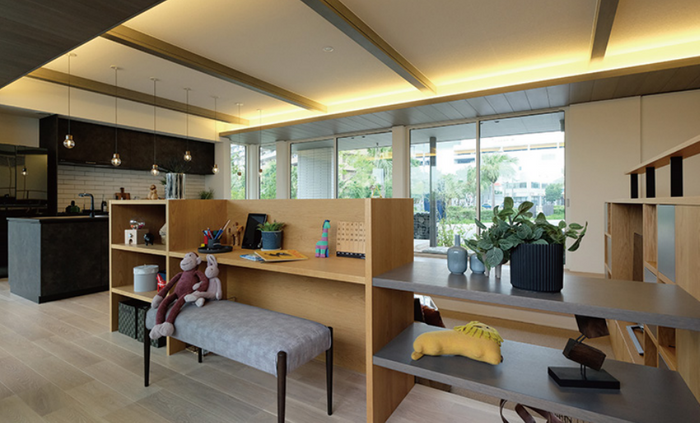 壁は設けずに家具やインテリアで空間を仕切ることで、空間のつながり、家族のつながりが感じられながらもパーソナルな空間も保てます。例えば、オープンシェルフや本棚も空間を分けるインテリアとして活用できます。また、机の方向を外向けにすることで、部屋の中でも別途コーナーを作ることも可能です。