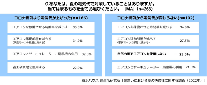 コロナ禍で、自宅で過ごす時間が増えた方(n=268)の中で、電気代が上がったと回答した方(61.9%)と電気代が変わらないと回答した方(38.1%)の電気代対策を比較したところ、電気代が変わらないと回答した方は「自然の風でエアコンを使用しない」方が多い傾向となりました。政府から節電に応じたポイント制度等を導入する発表もあり、この機会に、室内の風の通りを見直し、電気の効率的な利用を検討してみるのもよいかもしれません。