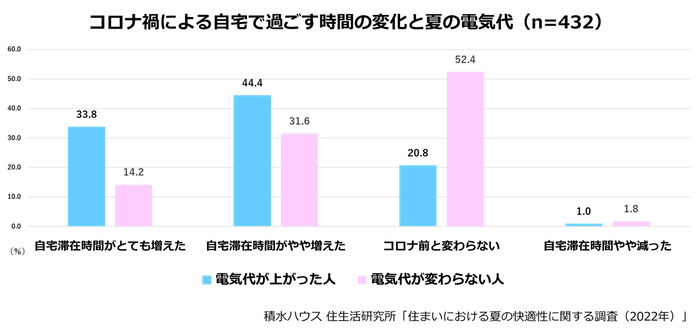上記の平均モデルにおける夏の電力料金は、コロナ禍前後で取り立てて変わっていない(2019年8月:7,181円、2020年8月:6,928円、2021年8月:6,960円)※2中、エアコン利用者のうちコロナ禍前より電気代が上がったと回答した方が44.2%、電気代は変わらないと回答した方が48.1%でした。電気代が上がったと回答した方の多くは、コロナ禍で、自宅で過ごす時間が増えており、一方で、電気代は変わらないと回答した方は、コロナ禍前後で、自宅で過ごす時間は変わっていないとの回答が半数を超えました。このことからおうち時間が増えたことは電気代の上昇に影響しているといえるでしょう。