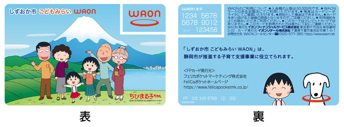 今回発行されるご当地WAON「しずおか市こどもみらい WAON」※のカード表面には、富士山、茶畑、駿河湾を背景に静岡市出身のさくらももこさんの作品である「ちびまる子ちゃん」がデザインされています。