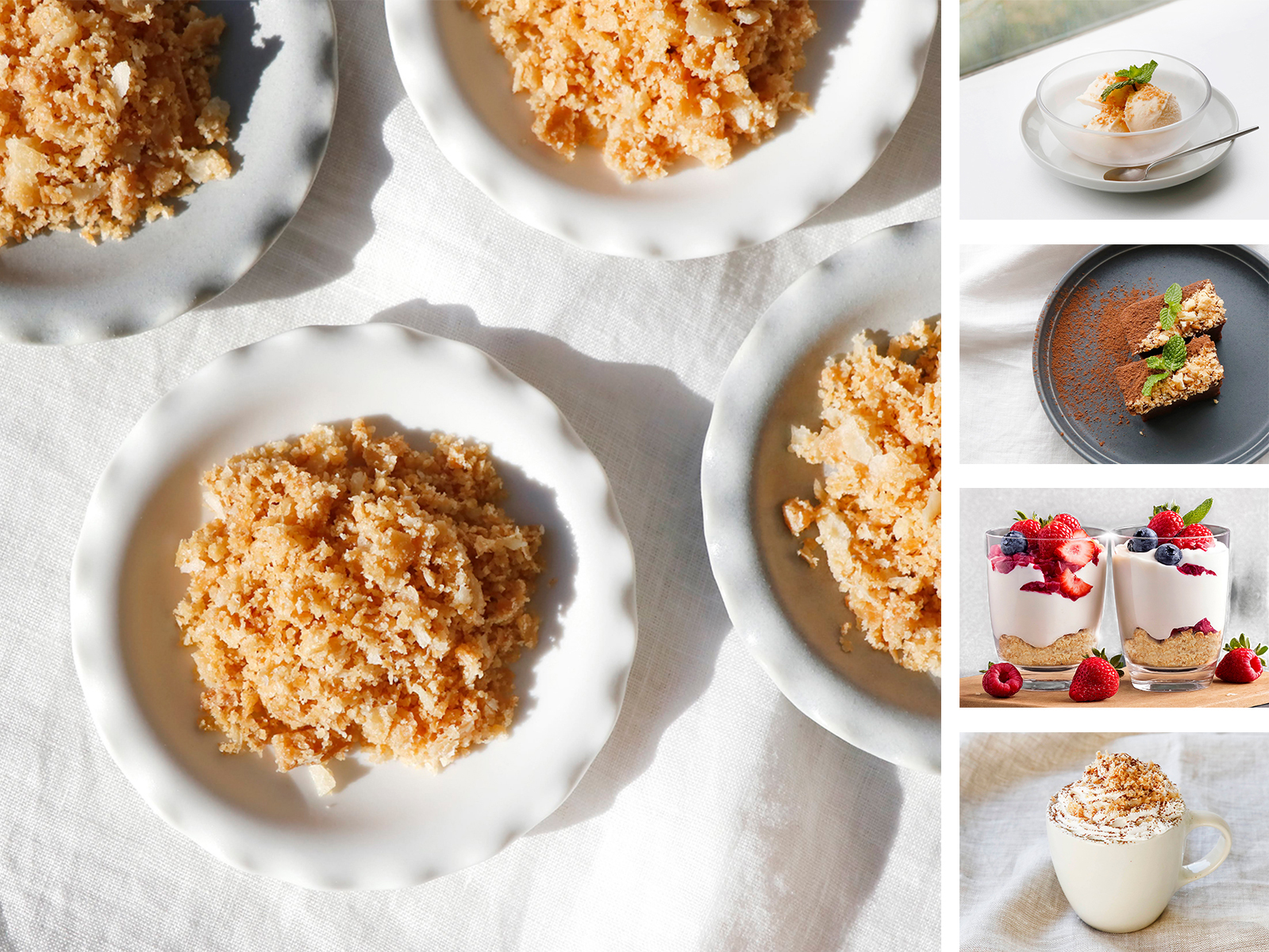 ケーキやパフェ、アイスクリーム、チョコレートなどのデザートのトッピングとしてはもちろん、クッキーに混ぜ込んだり、キャラメリゼしてトライフルに入れたり、クリスピーチキンの衣に使ったりなど、シンプルだからこそ、アイデア次第で様々なアレンジにもご活用いただけます。