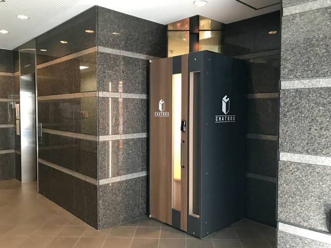 CHATBOX本体は、弊社グループ「ディシディア・ワイム株式会社」のデザインチームによるスタイリッシュなデザイン。ブース内には、ご利用者様に快適にご利用頂けるよう様々な機能が備え付けられています。