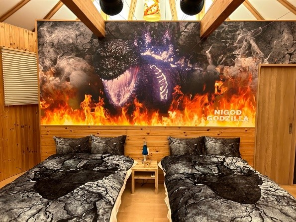 室内には、歴代ゴジラと人気怪獣たちが描かれたインテリアやタペストリー、窓越しに見える実寸大ゴジラの一部、さらに、それらに光の照射で見え方が変わる特殊加工を施すことによって、昼・夜で異なった室内の雰囲気をお楽しみいただけます。室内に隠れた全ての怪獣たちを見つけ出すことで豪華特典が手に入る“特別任務”に挑戦していただくなど、昼夜通してお愉しみいただけるお部屋です。