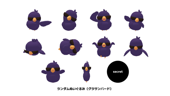 ・ランダムぬいぐるみ(全11種):「グラサンバードのぬいぐるみアクセサリー」(通常10種+レア1種)