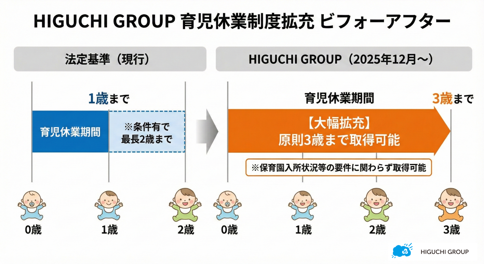 HIGUCHI GROUP(本社:長崎県西彼杵郡時津町/代表:樋口 益次郎)は従業員が安心して働き続けられる環境づくりの一環として、人事制度の改定を行いました。育児休業を最長3歳に達するまで取得可能にする「育児休業制度の拡充」と、時効で消滅する有給休暇を積み立てて病気や介護時に使える「失効年休積立制度」を、2025年12月より運用開始したことをお知らせいたします。