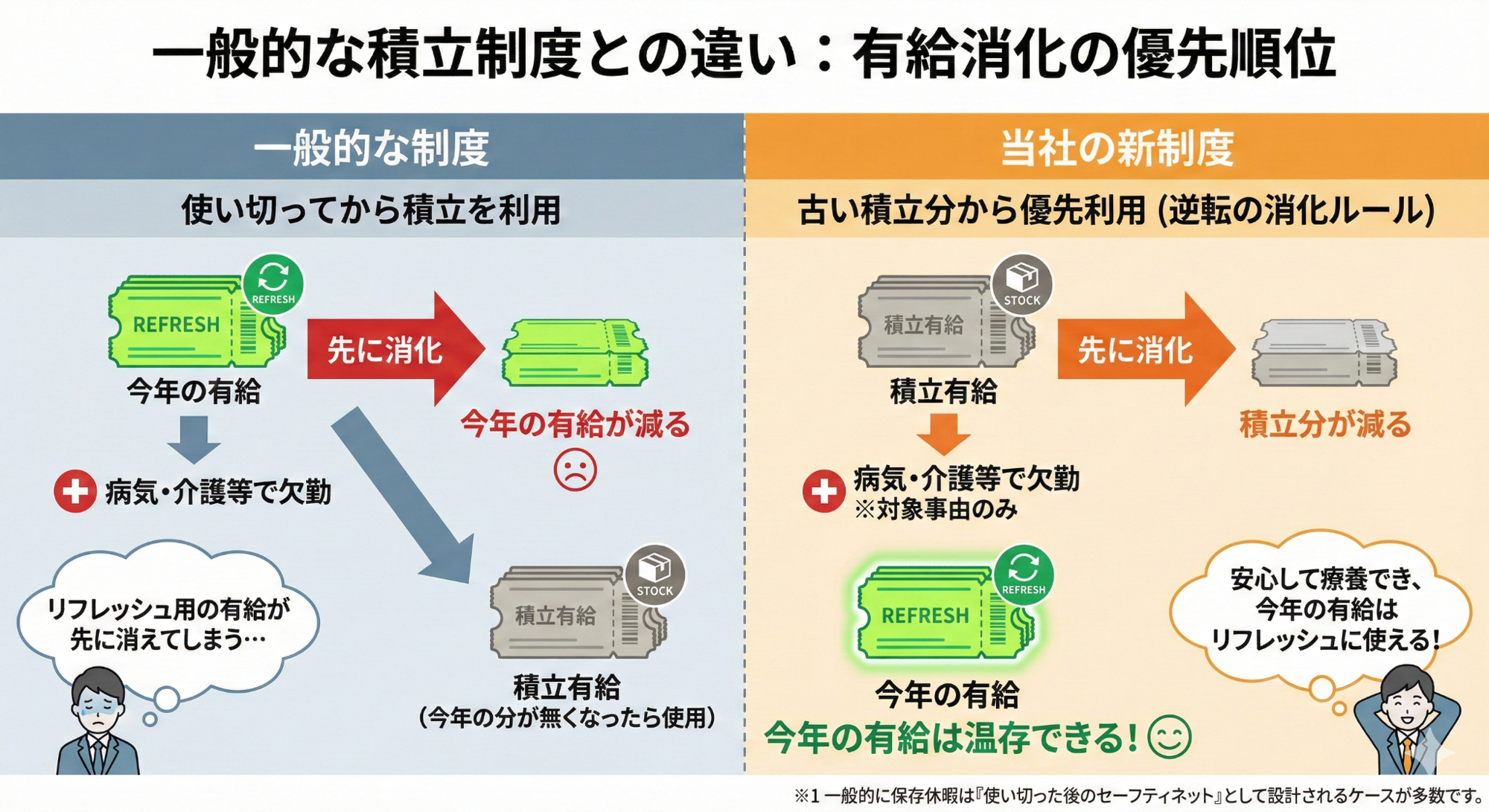 「失効年休積立制度」:一般的な制度とは逆!「積み立てた(古い)分」から先に消化でき、リフレッシュ用の「今年の有給休暇」を温存できる仕組み。
