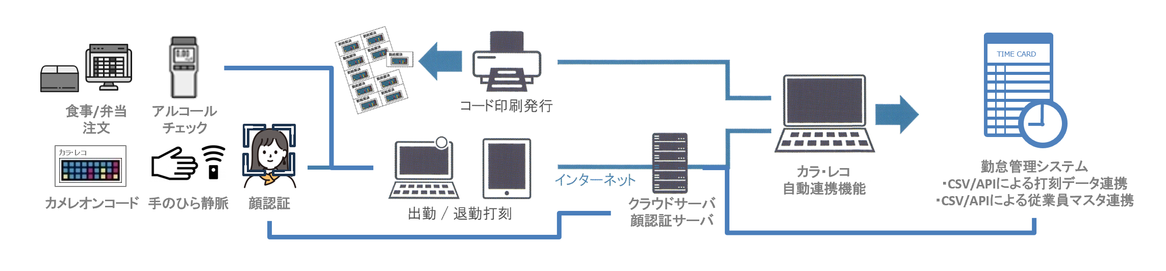 「カラ・レコ」は、パソコンやタブレット、インターネット環境のみで導入可能なクラウド型打刻管理アプリケーションです。市販のWindows端末やiPad(注1)を用いて、カメレオンコード認証(注2)、手のひら静脈認証「PalmSecure」(富士通株式会社および富士通フロンテック株式会社)(注3)、さらに顔認証に対応しており、簡単かつ低コストで出退勤打刻を管理できます。
