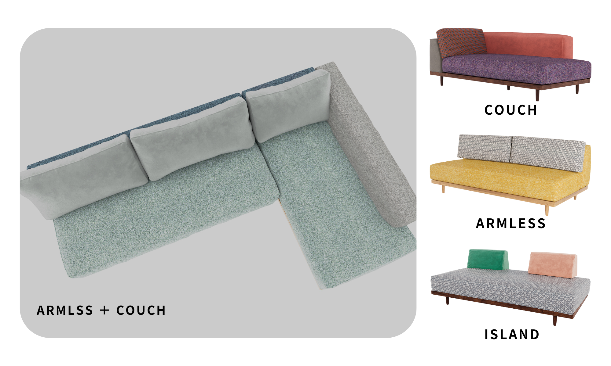 TILOは、カウチ、アームレス、アイランドの3タイプをご用意しております。お客様のお部屋の広さやレイアウトに合わせて、最適なタイプをお選びいただけます。広々とした空間には、カウチとアームレスを組み合わせたスタイルもおすすめです。
