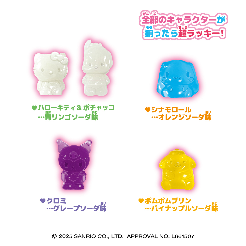 ハローキティ、ポチャッコは青りんごソーダ味、クロミはグレープソーダ味、シナモロールはオレンジソーダ味、ポムポムプリンはパイナップルソーダ味。