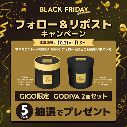 対象のアカウントをフォローし、該当ポストをリポストしていただいた方の中から抽選で5名様に、11月1日(土)より登場予定の「GiGO限定 GODIVA ブラックフライデープライズ2種セット」をプレゼントいたします。