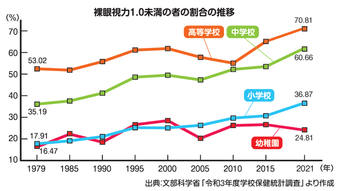 近年、近視の低年齢化が危惧されています。文部科学省が行っている学校保健統計調査によると、近視の子どもは年々増加しています。なかでも小学生の近視はこの40年で約2倍に増加しており、ここ数年で他の年代に比べても大きく割合を増やしています。背景にはゲーム機やスマートフォン、学校や塾でのデジタル端末の利用など、近くを長時間見る「近業」により、目を酷使している環境があると考えられています。