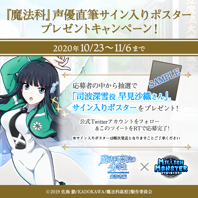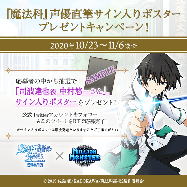 ミリオンモンスターの公式Twitterアカウント『【公式】ミリオンモンスター(@mmon_ex)』をフォロー&対象ツイートをRTしていただくことで応募することができます。また、RTキャンペーンは対象ツイート毎に応募可能です。各応募者の中から抽選で1名様(合計4名様)に声優直筆サイン入りポスター、3名様にねんどろいど「司波達也」をプレゼント!