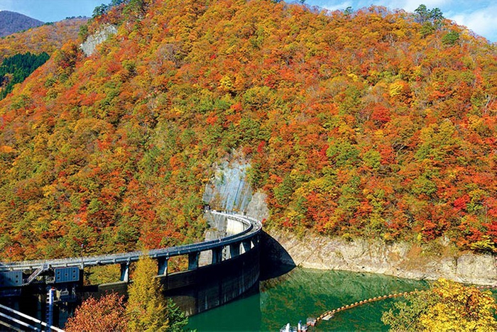 宿から車で約7分、東北随一の紅葉の名所として知られる「鳴子峡」。深さ約100mもの大峡谷が約2.5km続き、美しい紅色や鮮やかな黄色に染まる絶景が広がります。大深沢遊歩道を散策して、さわやかな空気と共に紅葉狩りが楽しめるスポットです。また、宿から車で約5分、鳴子峡から車で約15分のところに、東北初のアーチ型ダムで日本初の「日本人だけで作ったダム」としても有名な「鳴子ダム」があります。紅葉の季節になると、ダム周辺からの景色は渓谷美が広がる絶景で、ダム湖の水面に赤や黄が彩りを添えます。紅葉の見ごろは例年10月中旬~11月上旬です。
