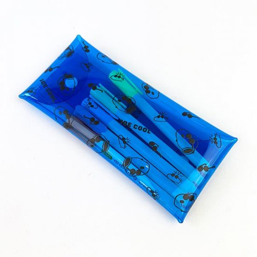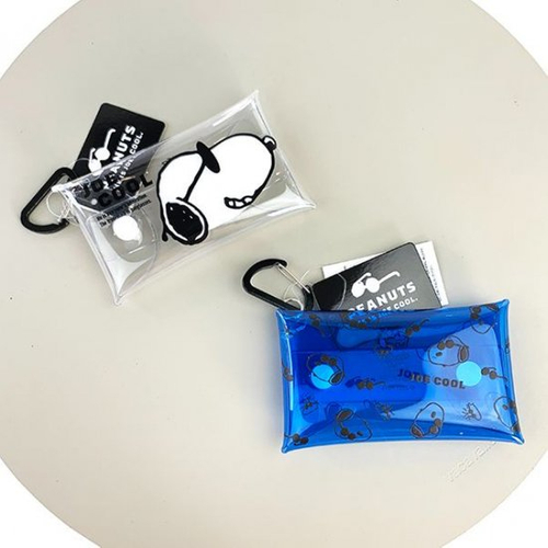 ブルーのポーチは、ジョークールスタイルのスヌーピーやサングラスなどの総柄になっています。濃いめのブルーですが、スケルトンなので涼し気です♪