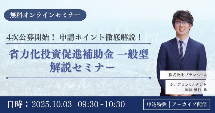 株式会社プランベース(本社:東京都新宿区、代表取締役:武衣 貴志)は、第4回公募が公開された「省力化投資補助金 一般型」に関するWEBセミナー を、2025年10月3日(金)に開催いたします。