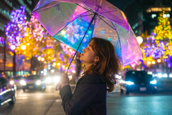 冬のイルミネーションにも映えるオーロラビニール傘で幻想的な世界をお楽しみください。