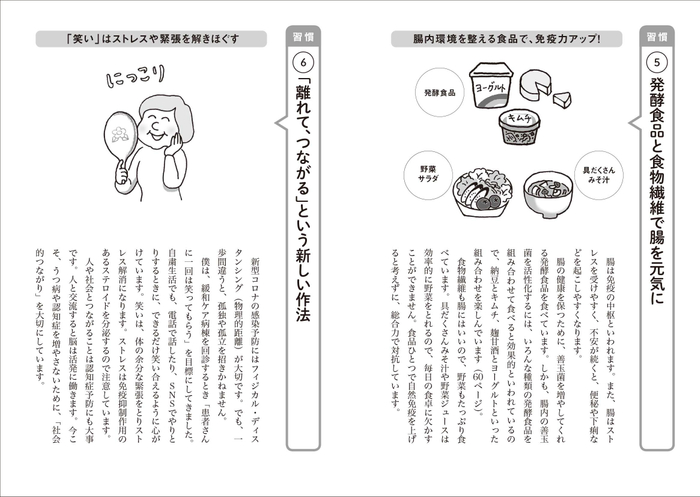 巻頭ページでは、新型コロナウイルスから身を守るための「免疫力を上げる7つの習慣」を特別収録。新型コロナへの対策は、認知症予防にも通じる点が多くあります。長引くコロナ禍においても孤立を防ぐ方法、重症化のリスクとなる高血圧などを防ぐ食生活のひと工夫や、運動不足の解消と生活リズムを整える方法など、写真や図解でわかりやすく解説しています。
