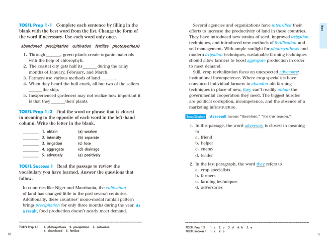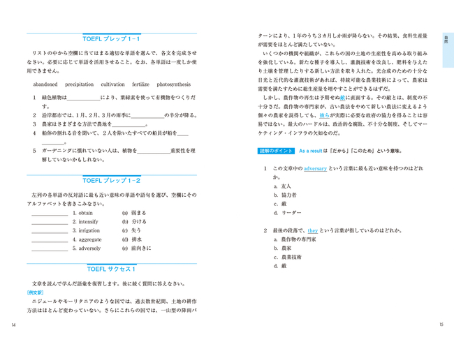 最後の「TOEFLサクセス」は、実際のTOEFL®形式の読解文と問題が1問または2問ついている練習問題です。ほとんどの「TOEFLサクセス」の読解文には10個の必須単語がすべて含まれており、多くの場合、「読解のポイント」も示されています。