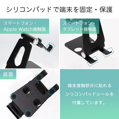 スマートフォンやタブレット、Apple Watch等の端末と接触する底面および土台部分には、シリコン素材のパッドが付いており、端末とスタンド、スタンドとデスクの設置面を保護しながら、滑り防止にもなります。