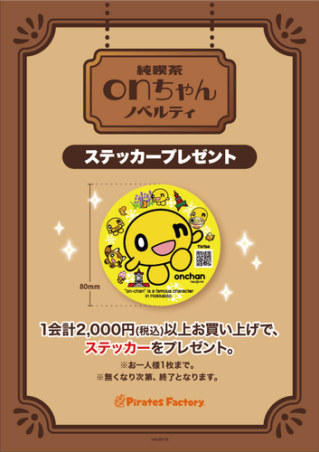 純喫茶onちゃんSHOPでグッズを1会計で2,000円(税込)以上お買い上げいただいた方に、「ステッカー」1枚をプレゼント!