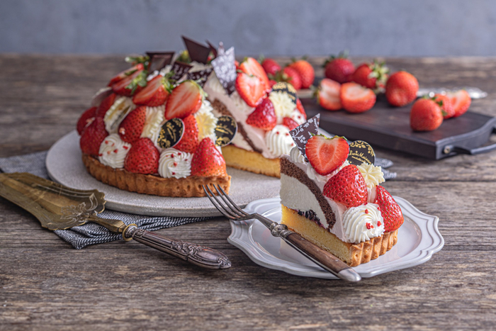 ほろ苦いブラウニータルトにチョコレートムースをいちごのムースで包み込み、アクセントにベリーのジュレをしのばせました。ラズベリーのマカロンが可愛らしい限定ケーキです。
