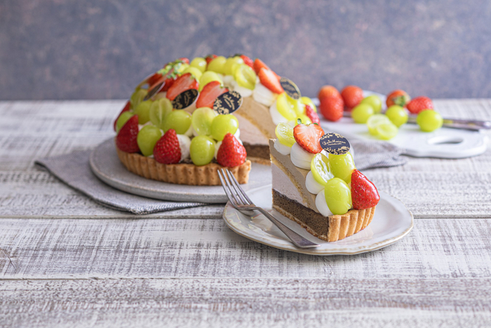 ダージリンティータルトに甘酸っぱいいちごクリームと紅茶クリームを重ね、ピーチアプリコットジャムをしのばせました。紅茶の香りと甘さたっぷりのシャインマスカットをお楽しみいただける限定タルトです。