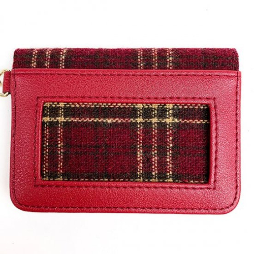 深い赤が秋冬らしさ満載の、2つ折りのパスケースです。ベージュの入り具合も絶妙なタータンチェックで、暖かみのある起毛素材にも惹かれます。