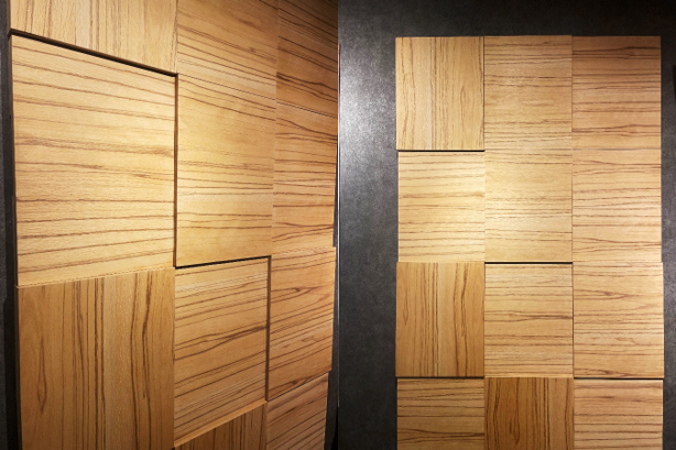 一番の課題は、世界的な原木減少による輸出規制などにより、従来の日本の突板の世界で使われていた「突板ランクの原木」が顕著に減少していることです。日本の突板の半分以上は外国産材の原木から生産されています。突板製造に関わる責任としてサステナブルなモノづくりを考えるにあたり、外国産材の原木であっても従来の選木から排除された個性的な原木の突板への活用を考えました。また、日本の広葉樹の森への還元として貢献できるよう、国産材の原木の突板への活用も積極的に行っており、SDGsやサステナブルなストーリーを内装に展開できる点は試作段階においても高い評価を得ています。