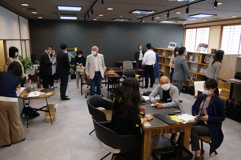 また、当オフィスでは冨永ボンド氏のウォールアートをはじめ、オフィス家具に関しては、株式会社 東馬(本社:佐賀県神埼市、代表取締役社長 東島眞介氏)がデザイン・プロデュースを手掛け、こだわりの詰まった数々の家具を展示し、当日はイベントを含め、市内外の関係者さまをはじめ、多くの多久市民のみなさま約50名もの方にお越しいただき、オフィスの内覧・体験をいただきました。