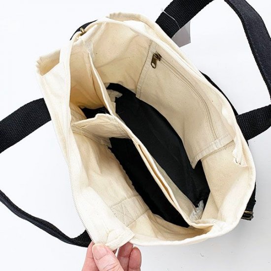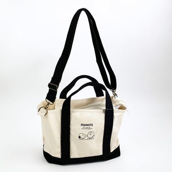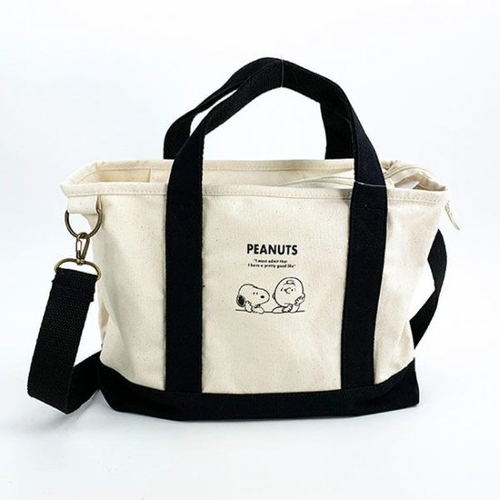 ミニサイズのトートバッグで2WAY仕様、丈夫なキャンバス素材と魅力たっぷりのアイテムです。底や持ち手部分は黒で、シックナデザイン。もちろんキュートなスヌーピー&チャーリーブラウンのデザインも魅力です。