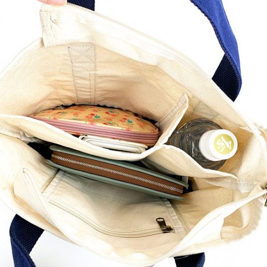 ご覧のように、内側は大きく分けて3つの部屋に分かれています。部屋の大きさや形状も違うので、小物に合わせて収納できて便利。ファスナー付きポケットもあるので、大事な物の収納もお任せください。
